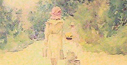 This delightful summer scene includes two figures, mother and child, as if heading home after a day of picking berries, their pails full. Just ahead they will reach the homeplace and a cool drink of water.