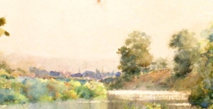 The focal point of this original watercolor is where the Kentucky River bends and in the distance the skyline downtown Frankfort. Sawyier draws the viewer to this point by "enclosing" it with trees on the left and right and by the path inthe foreground.